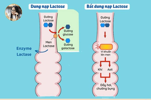 Bất dung nạp lactose là tình trạng cơ thể không có khả năng tiêu hóa hoàn toàn đường lactose, một loại đường tự nhiên có trong sữa và các sản phẩm từ sữa. Nguyên nhân sâu xa đến từ sự thiếu hụt hoặc hoạt động kém hiệu quả của enzyme lactase trong ruột non. Enzyme này có nhiệm vụ phân tách đường lactose thành hai loại đường đơn giản hơn là glucose và galactose để cơ thể dễ dàng hấp thụ. Khi lactase không đủ, lactose không được tiêu hóa sẽ đi xuống ruột già, tại đây vi khuẩn sẽ lên men chúng, tạo ra khí và axit, gây ra các triệu chứng khó chịu cho bé.