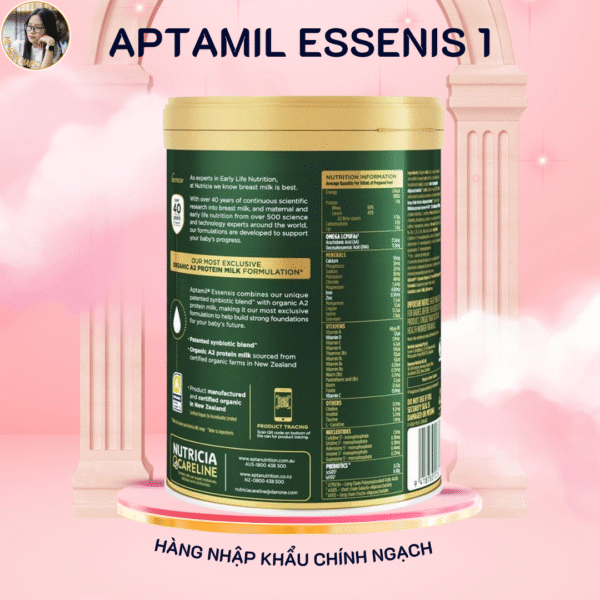 Sữa Aptamil Essensis Úc số 1 là dòng sữa công thức cao cấp dành riêng cho trẻ 0-6 tháng tuổi. Sản phẩm sở hữu đạm sữa A2 hữu cơ chất lượng cao, kết hợp tổ hợp Synbiotic độc quyền và lợi khuẩn Bifidobacterium M-16V giúp hỗ trợ hệ tiêu hóa non yếu của trẻ 0-6 tháng tuổi, tăng cường miễn dịch, giảm nguy cơ dị ứng và phát triển toàn diện.