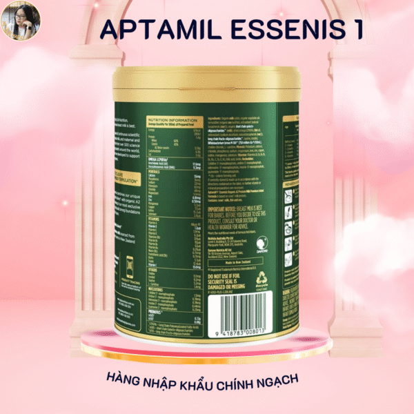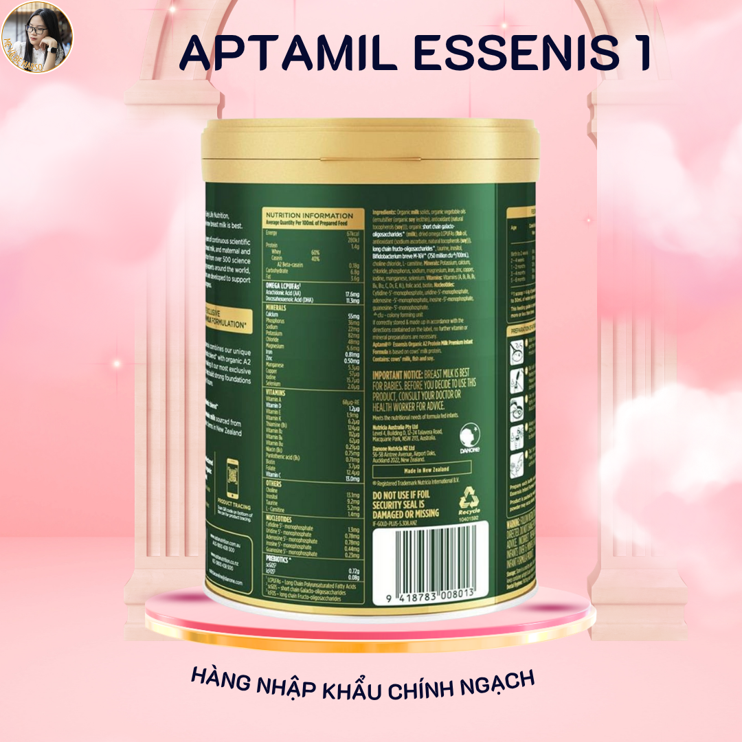 Chất rắn hữu cơ từ sữa, dầu thực vật hữu cơ (chất nhũ hóa lecithin đậu nành hữu cơ, chất chống oxy hóa tocopherols tự nhiên đậu nành), galacto-oligosaccharides chuỗi ngắn hữu cơ từ sữa, omega LCPUFAs khô (dầu cá, chất chống oxy hóa natri ascorbate, tocopherols tự nhiên đậu nành), fructooligosaccharides chuỗi dài, taurine, inositol, Bifidobacterium breve M-16V (750 triệu cfu/100mL), choline chloride, L-carnitine. Khoáng chất: Canxi, phốt pho, sắt, magiê, kẽm, đồng, i-ốt, mangan, selen. Vitamin: A, B1, B3, B5, B6, B12, C, D3, E, K1, axit folic, biotin. Nucleotide: Cytidine-5′-monophosphate, uridine-5′-monophosphate, adenosine-5′-monophosphate, inosine-5′-monophosphate, guanosine-5′-monophosphate. Sữa Aptamil Essensis Úc số 1 Organic A2 Protein Milk Premium Infant Formula dựa trên protein sữa bò. Chứa: cá, sữa, đậu nành.