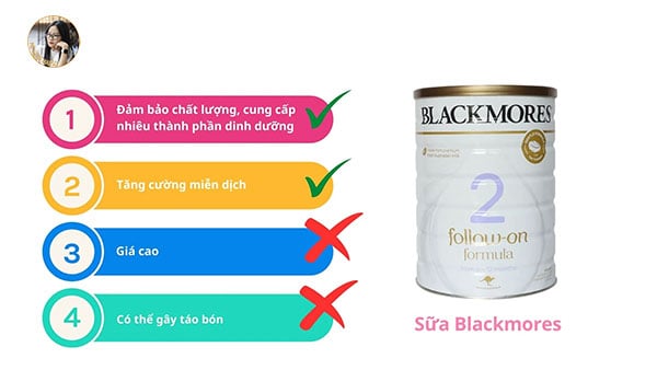 Blackmores với probiotics bổ sung (ở một số dòng) mang lại lợi ích tức thì hơn cho hệ vi sinh đường ruột. Tuy nhiên, việc sử dụng maltodextrin có thể gây đầy hơi ở một số trẻ nhạy cảm.